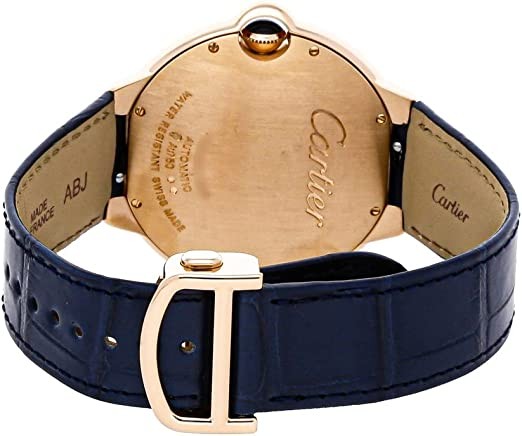 Blue dial. 18kt rose gold case with a blue (alligator) leather band. Automatic movement. 30 meters / 100 feet water resistance. Fixed bezel. Fold Over clasp. Case size 42 mm x 13 mm. Cartier wgbb0036 Ballon Bleu Watch.